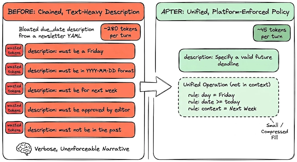 # ← None of this gets enforced — it's just noiseThat description is 280+ characters the reasoner reads on every turn but can never enforce. Rules packed into descriptions aren't enforced. The reasoner might ignore them or hallucinate compliance. Every character consumes tokens in every reasoning call.