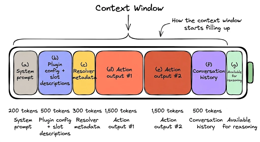 Every plugin has a context budget: the total information the reasoner can hold in working memory during a conversation. Slot descriptions, action outputs, conversation history, system instructions. All competing for the same finite window; builders fill it with noise before the conversation even starts.