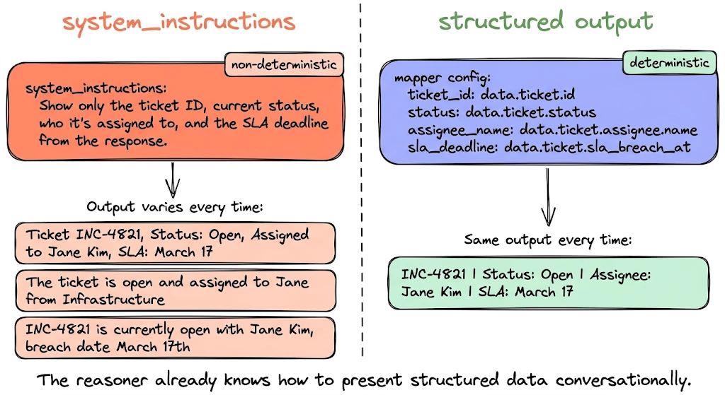 # ← Might hallucinate fields or drop the SLA entirelyWhen system_instructions is doing the field selection, the reasoner decides what to show. That's non-deterministic; you get different output every time. Sometimes the user sees: "Ticket INC-4821, Status: Open, Assigned to Jane Kim, SLA: March 17." Other times: "The ticket is open and assigned to Jane from Infrastructure." Same action, same data, different result.