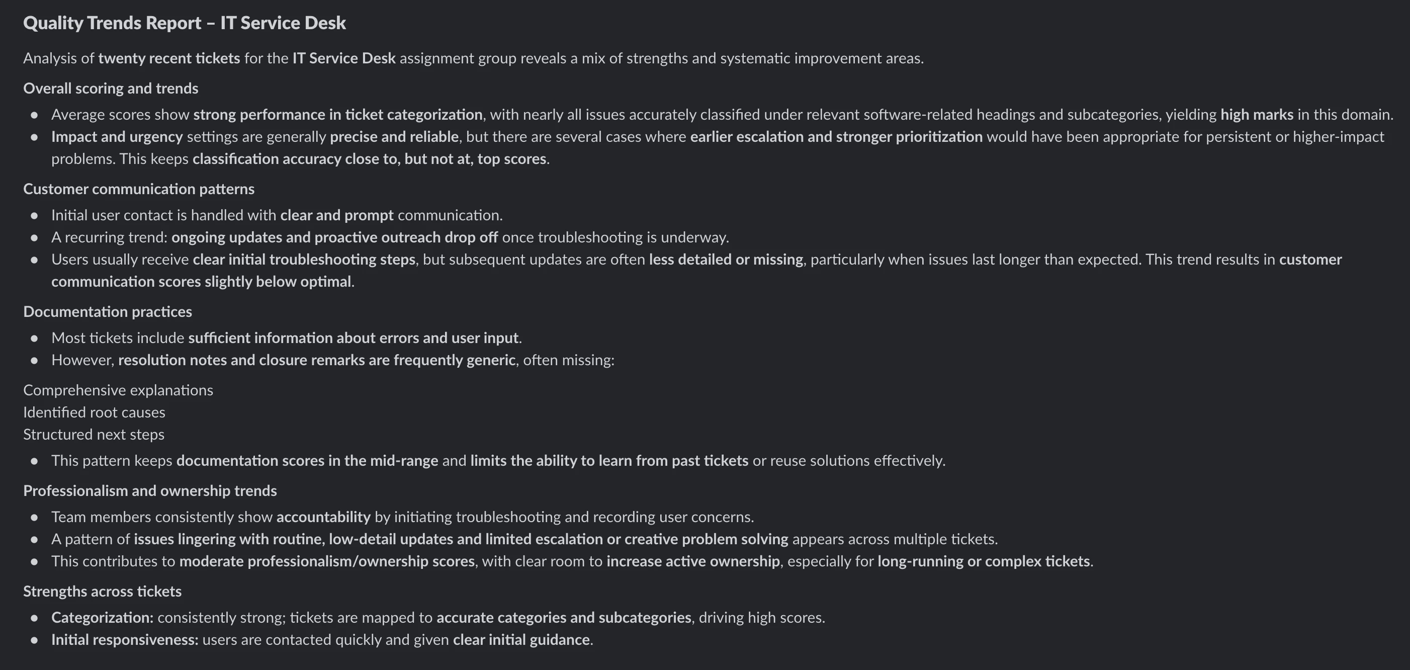 The goal is to evaluate the quality of resolved ServiceNow tickets on a recurring basis and provide structured feedback at both the agent and assignment-group level.