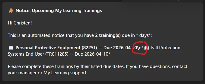 I have a notify step that uses RENDER() with a generated input string training_str. The template uses HTML tags (e.g. <b>) and a training_str built from a $MAP / $CONCAT expression, but the newline characters render literally (you see \n) when the message is sent to Teams. I’ve also tried "<br>" and "<br >" and they also end up displayed literally.