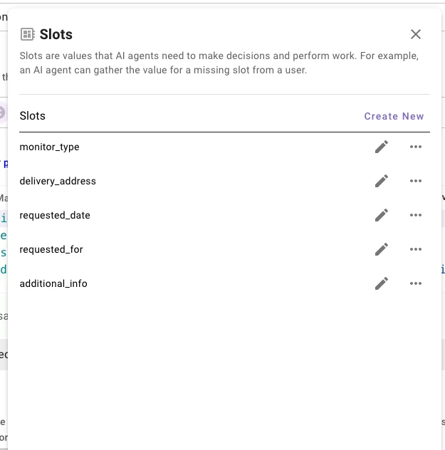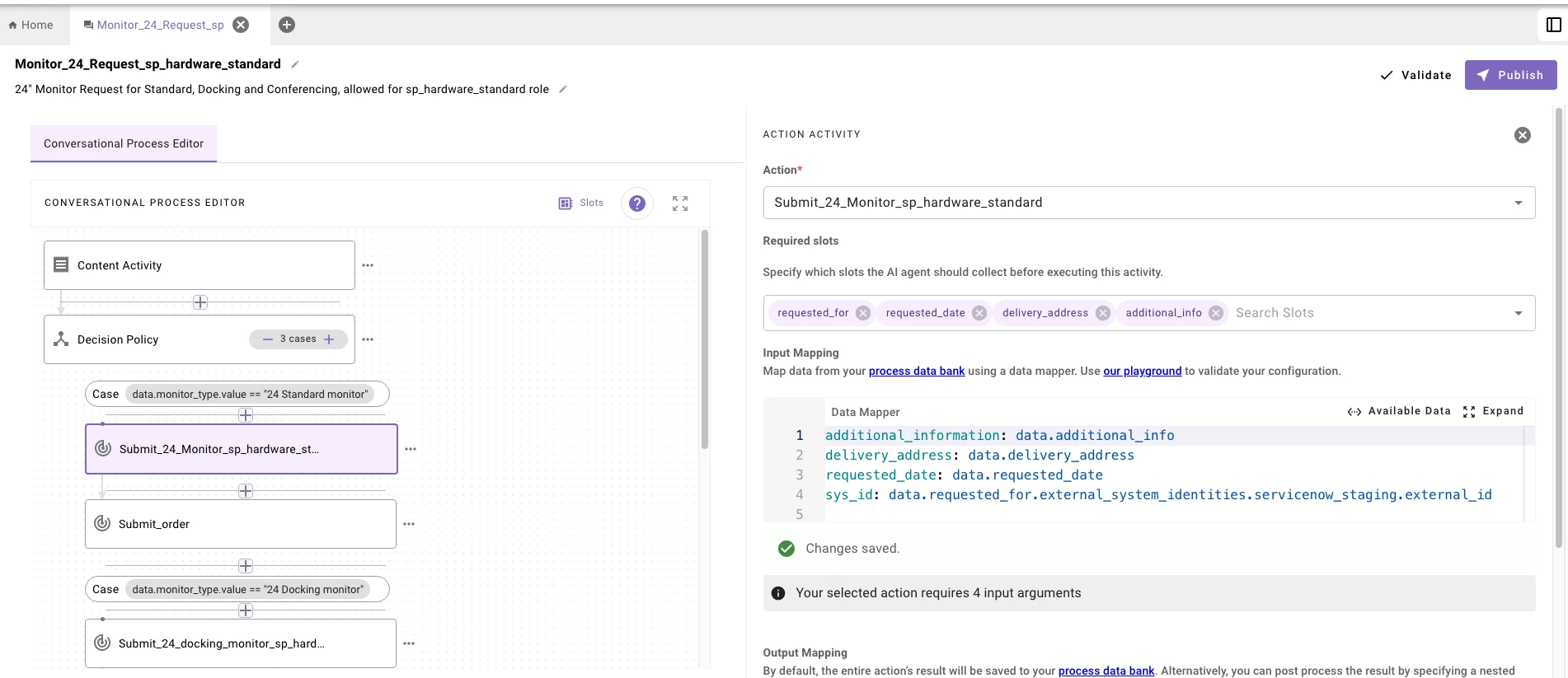 Decision policy (mandatory monitor type slot) → if X monitor is selected → call the action activity to submit the ticket in (mandatory all other slots).