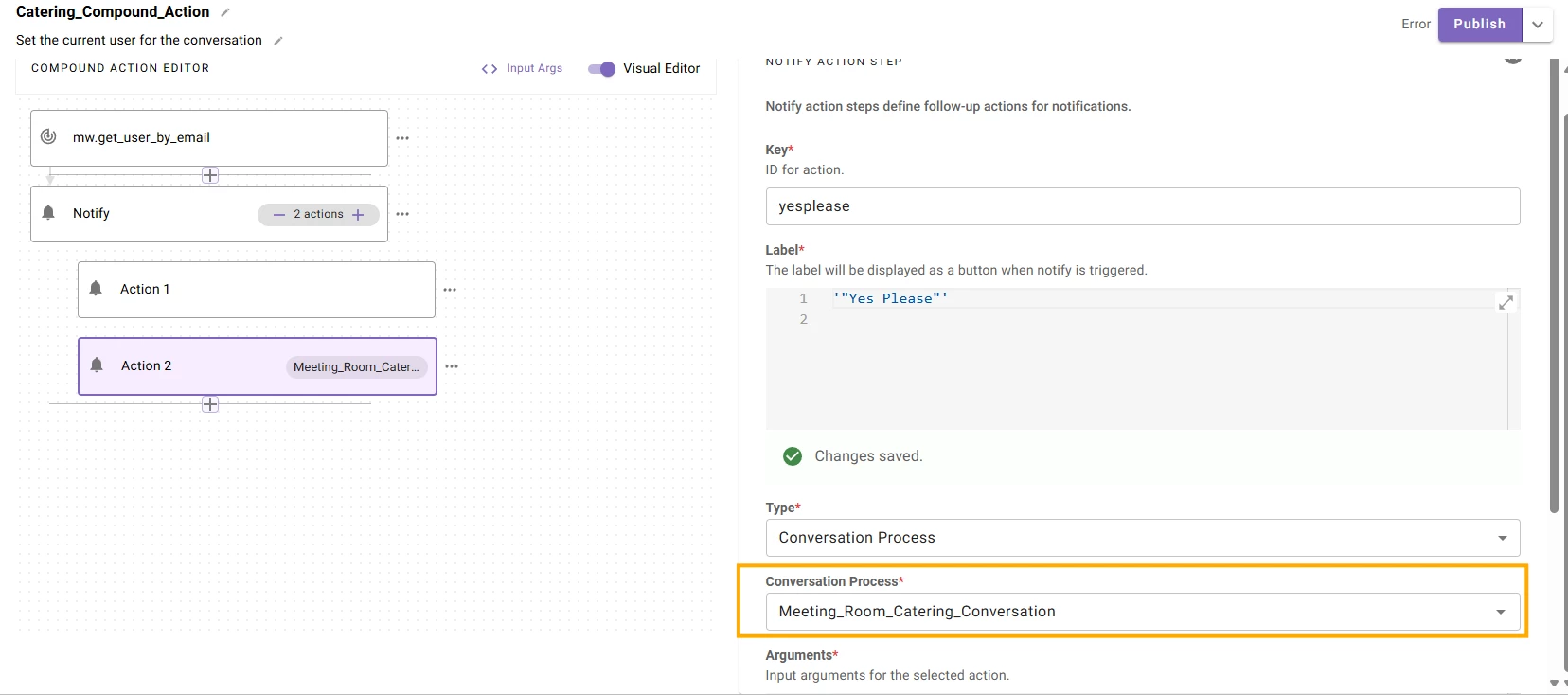 I have the following compound action, to be triggered from my Webhook, but it is telling me (as it also does in the documentation), that I need to publish my conversation as a plugin.