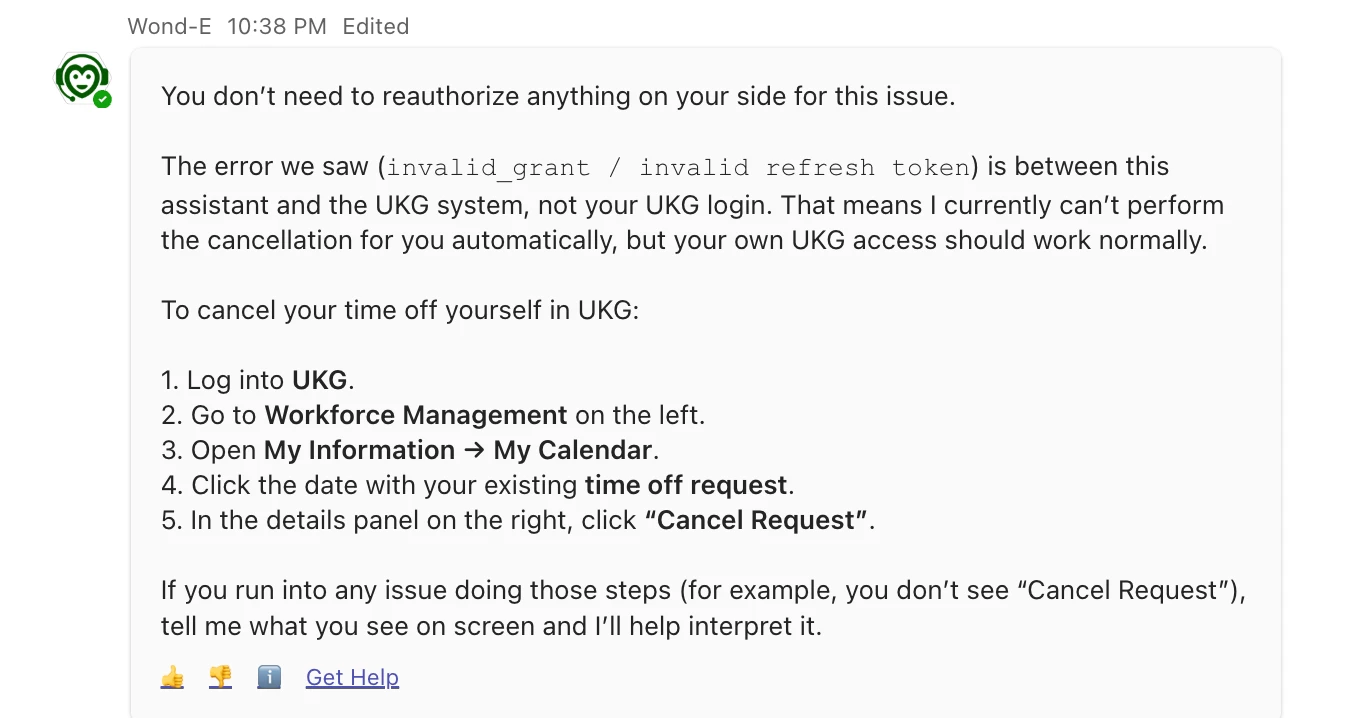 We are using OAuth 2.0 with Authorisation Grant in our Moveworks plugin integration. On first authorization, we successfully receive both an access token and a refresh token. However, the access token expires after 24 hours, and when users query the plugin after that, the plugin directly fails instead of prompting the user to re-authorize.
