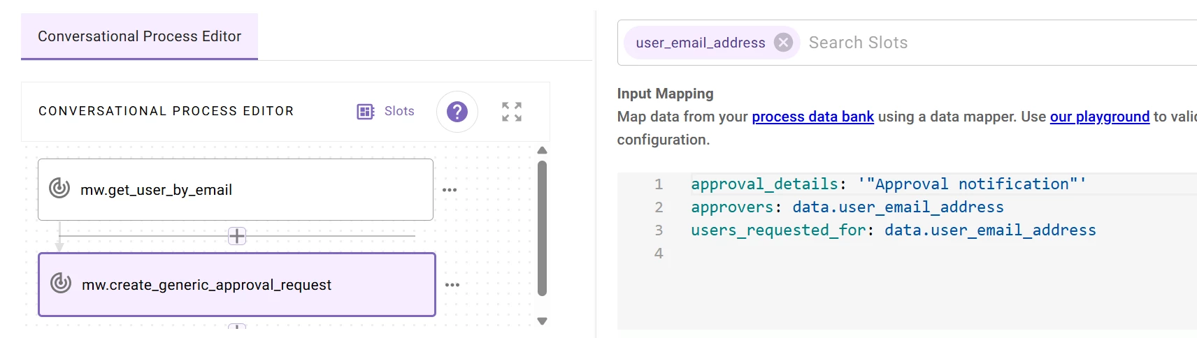 I am trying to add an approval workflow using the inbuilt Action “mw.create_generic_approval_request” however I am confused where to add the approver email address?. I am getting only two input parameters as given below.