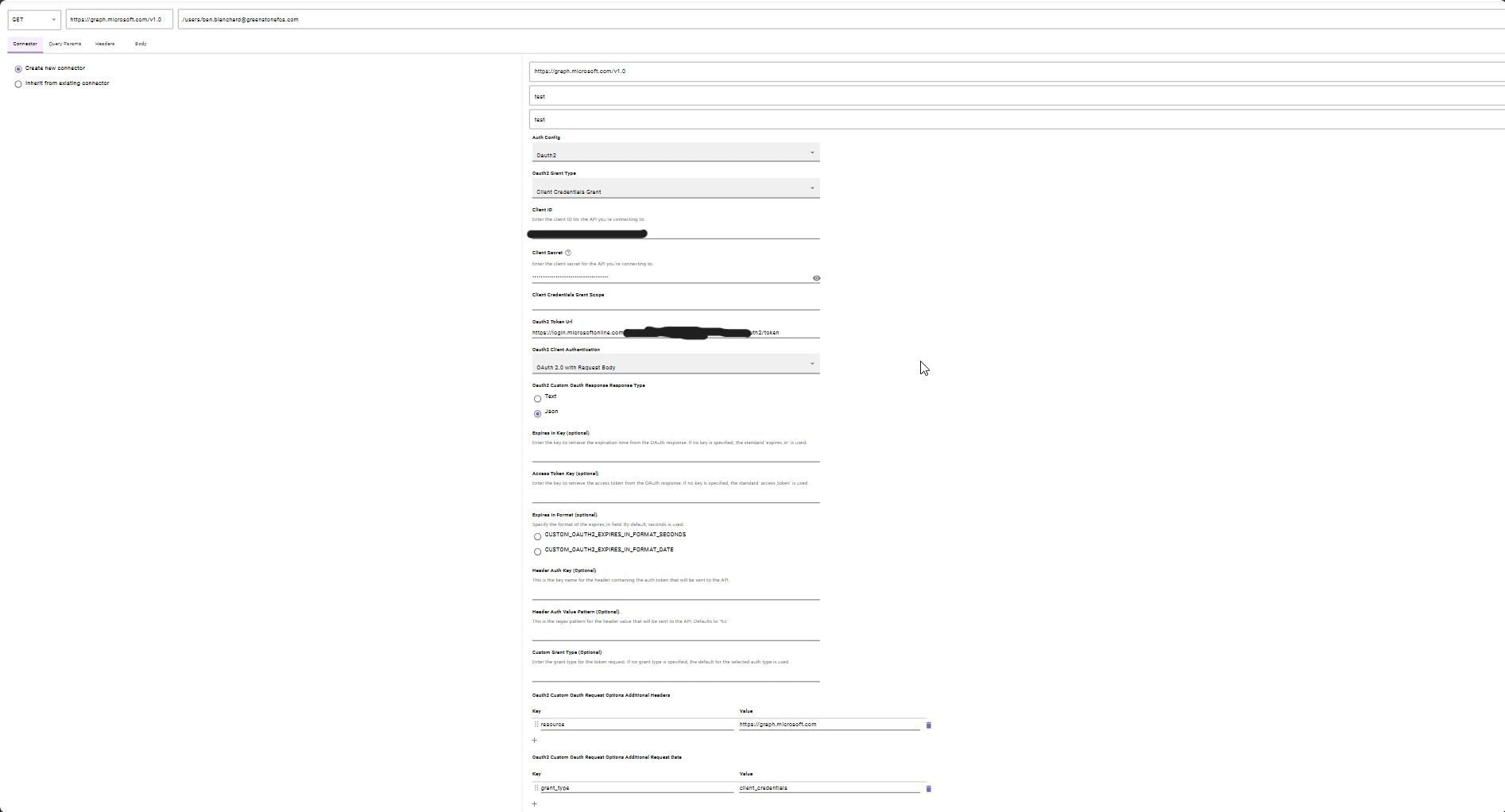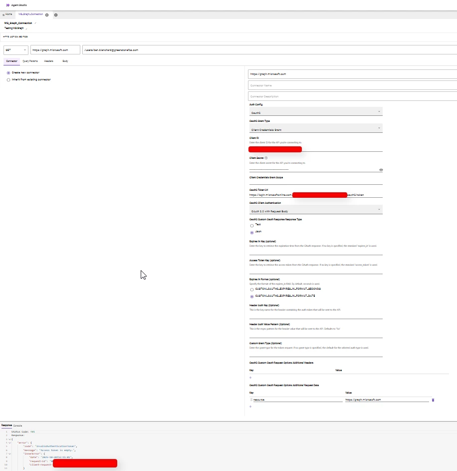 I am having issues setting up a Oauth2 for Microsoft products. I cannot get a successful API call even though I am able to with client credentials in Postman. Have others been having issues with this? Is there something I’m missing. I’ve been following this guide amongst trying many other things: Connector | Microsoft Graph