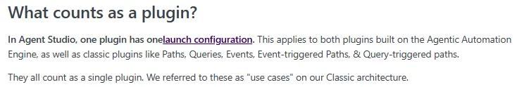 @Kevin Mok Thank you for your help, I really appreciate it! I have a couple more questions. If we get 20 plugins as part of our contract. Does any plugin that is already in Agent Studio Classic that’s been launched count towards that 20? What about any plugin that’s in draft? Or any plugin that launched but it’s only been launched to our developer?