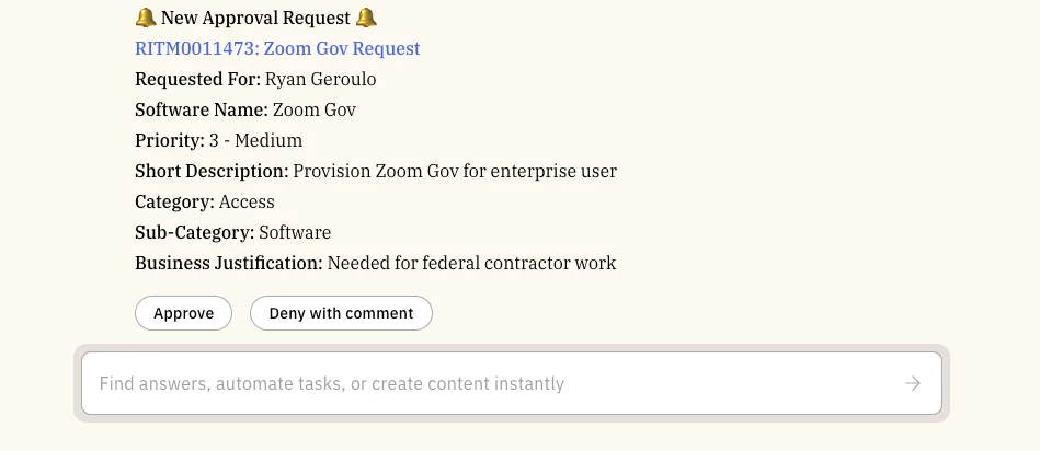 - Interactive Controls: It constructs "Approve" and "Deny" buttons, mapping them to the specific actions required to update the source record in ServiceNow.