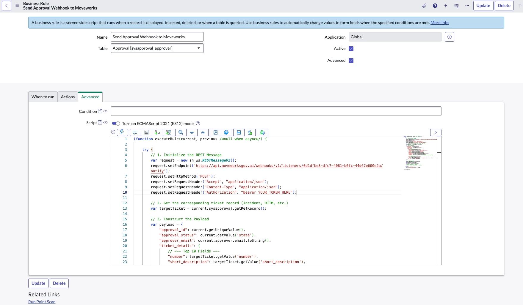 When an approval record is generated in ServiceNow, a Business Rule—configured on the sysapproval_approver table (or a custom equivalent)—automatically triggers an outbound webhook. This event notifies Moveworks of the activity and transmits the necessary approval metadata.