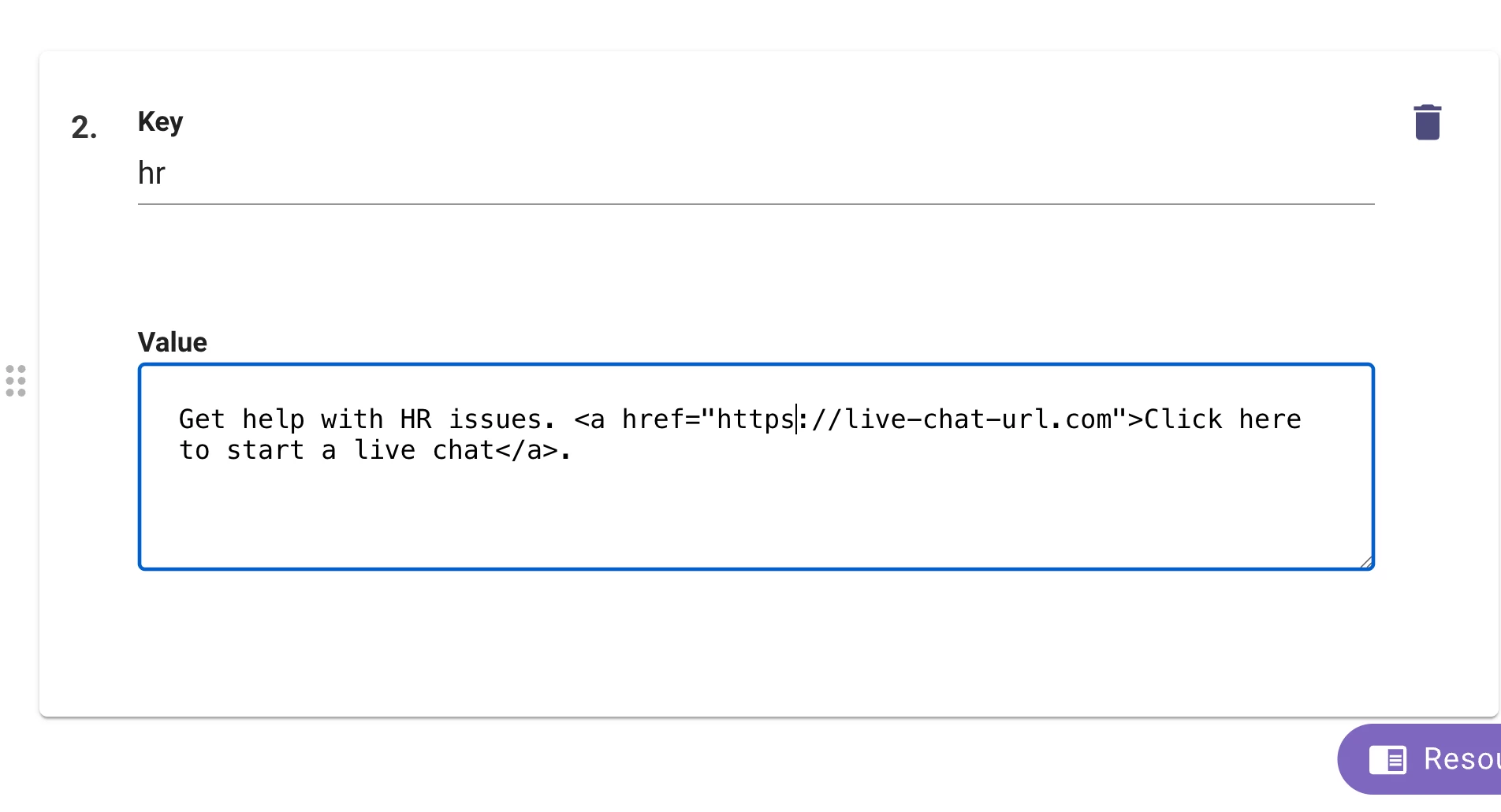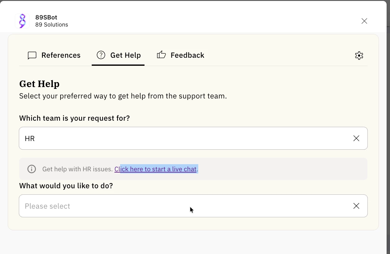 Today, the Live Agent Chat is shown as a separate option in the drop-down list, and the link is hard coded under each domain. Instead, I would like the Smart Handoff text itself to include a clickable link that will start a live chat with an agent.