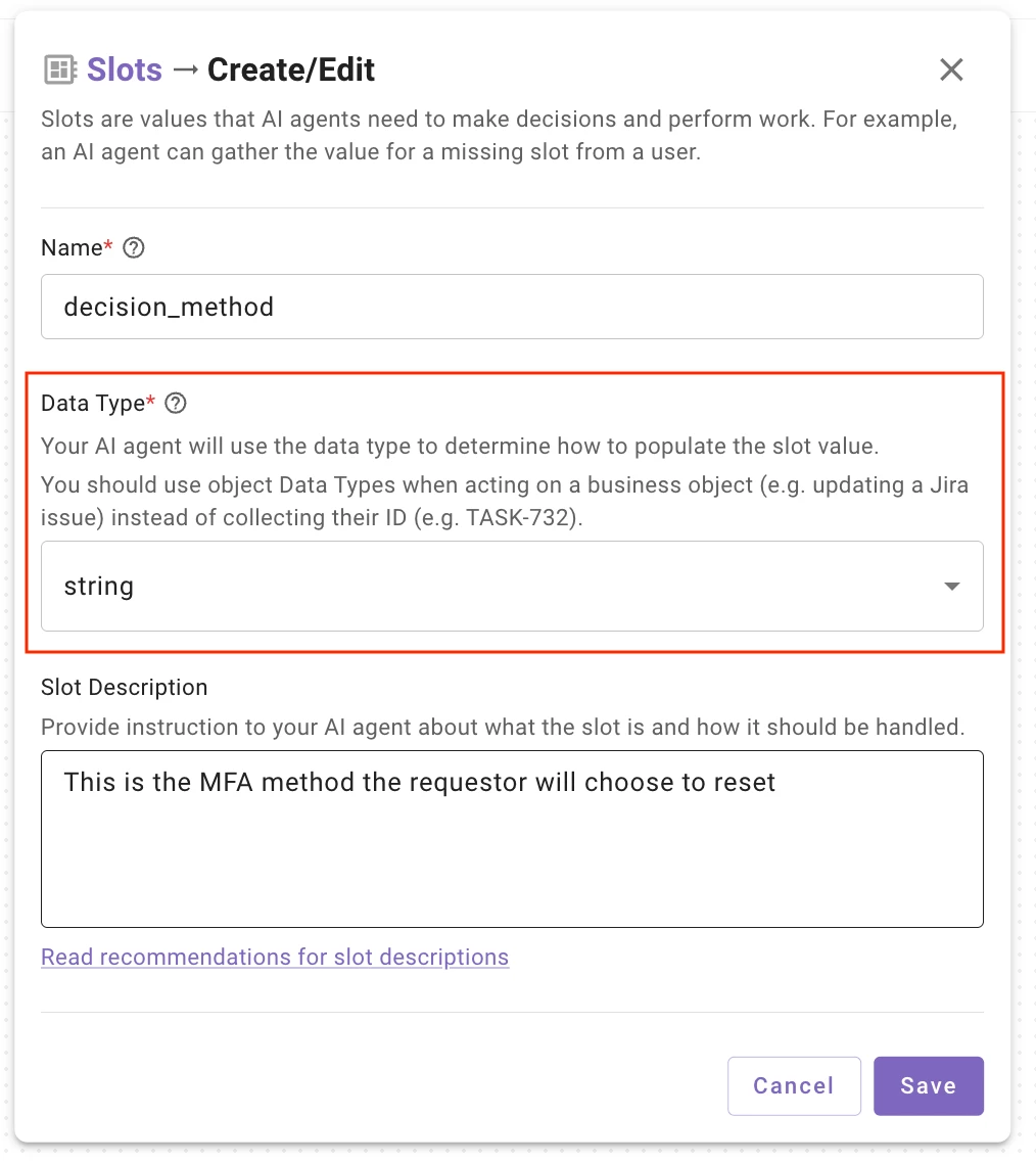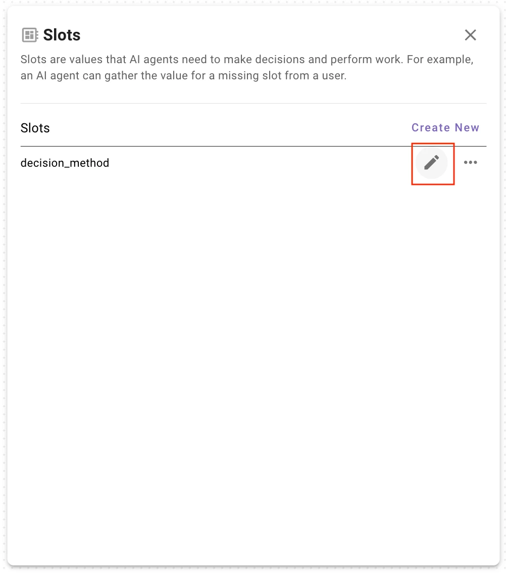 When working with the Agent Studio 2.0 and I find that I am unable to edit slots after they are created when building decision policies. I am not sure if I am missing something or this is just a limitation of the new Agent Studio. I find that once the slot has been created, I cannot go back and adjust the data type, slot retrieval details, etc. This would be a hinderance when building plugins as a new slot would have to be created any time a necessary change is needed.