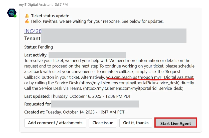 Without the ability to have the button to start a live agent chat from ticket notifications, the user needs to explicitly ask to start the live agent chat which treats it as a disconnected interaction.