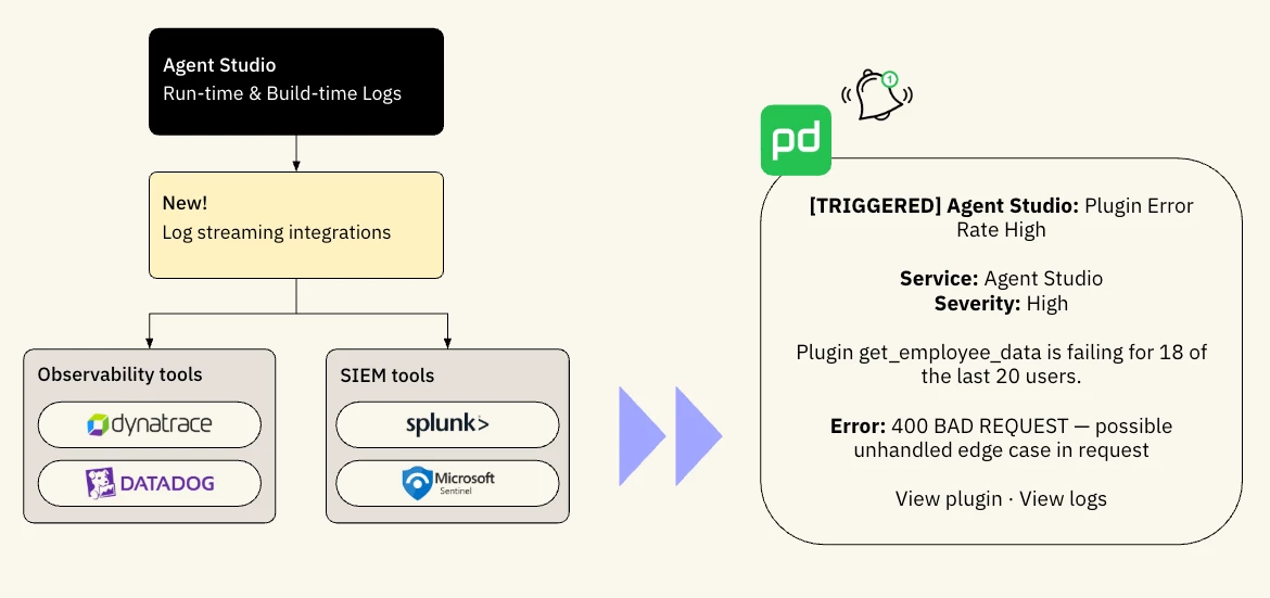Detect failures and route alerts to the right owners (and/or into third party tools) so teams can fix issues quickly. Pipe Agent Studio's run-time logs directly into your existing tools, so you can build the dashboards and incident response workflows you already have.