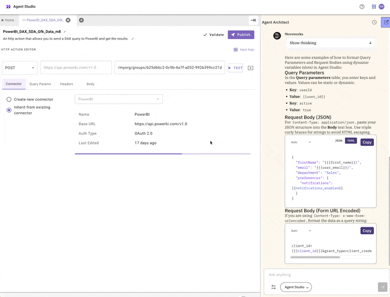 The new Agent Architect Panel provides contextual assistances, examples, and best practices to significantly accelerate your workflow, all directly inside Agent Studio.