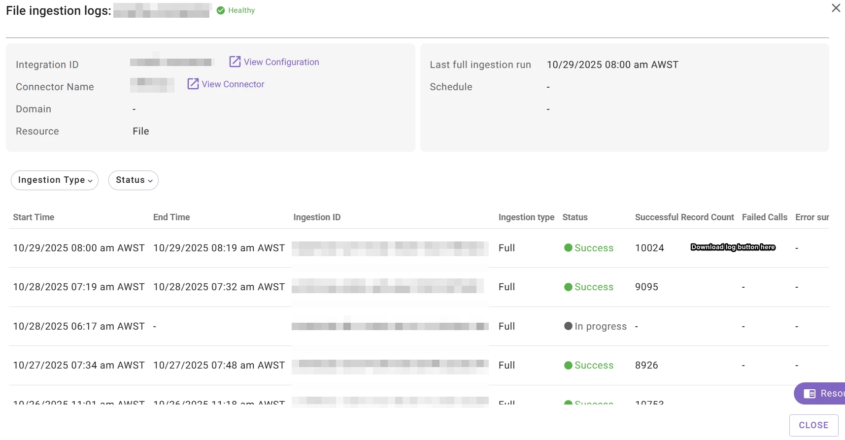I have attached a screenshot of where I could envision the download button per ingestion run would go to really narrow down where potential issues may occur