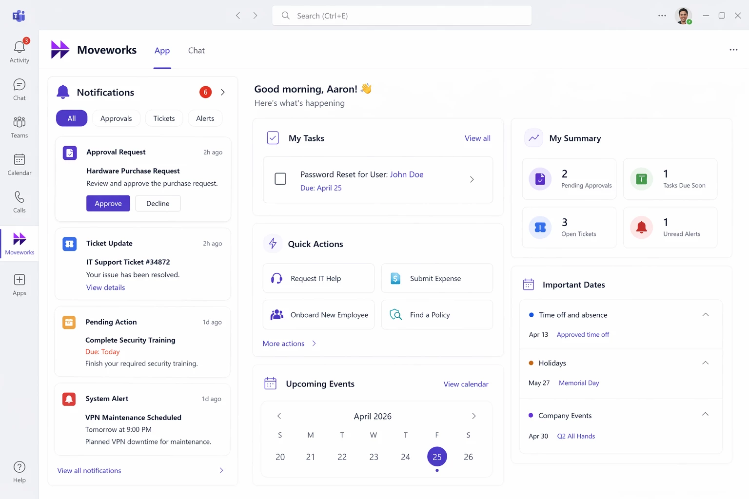 - Meet users where they are. Moveworks' own mission is to "meet employees where they are." For most enterprises, that's Teams or Slack — not a separate web portal. The notification experience should live there too.