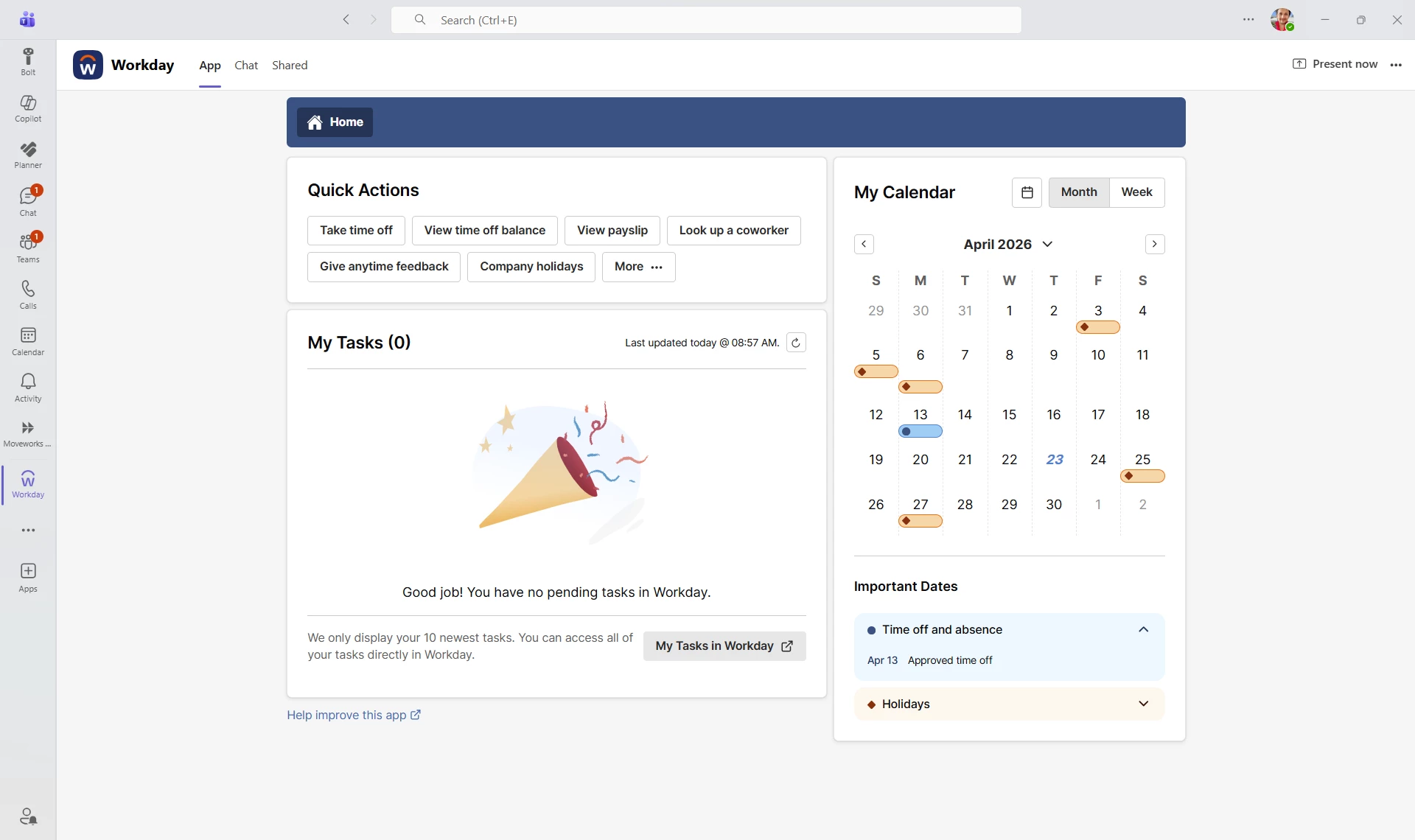 The Workday Teams app is a great reference. Its "App" tab shows Quick Actions, tasks, and calendar events — completely separate from the "Chat" tab where users interact with the Workday bot. Notifications like time-off approvals appear in Chat, but the persistent task list lives in App. This separation keeps things clean and actionable.