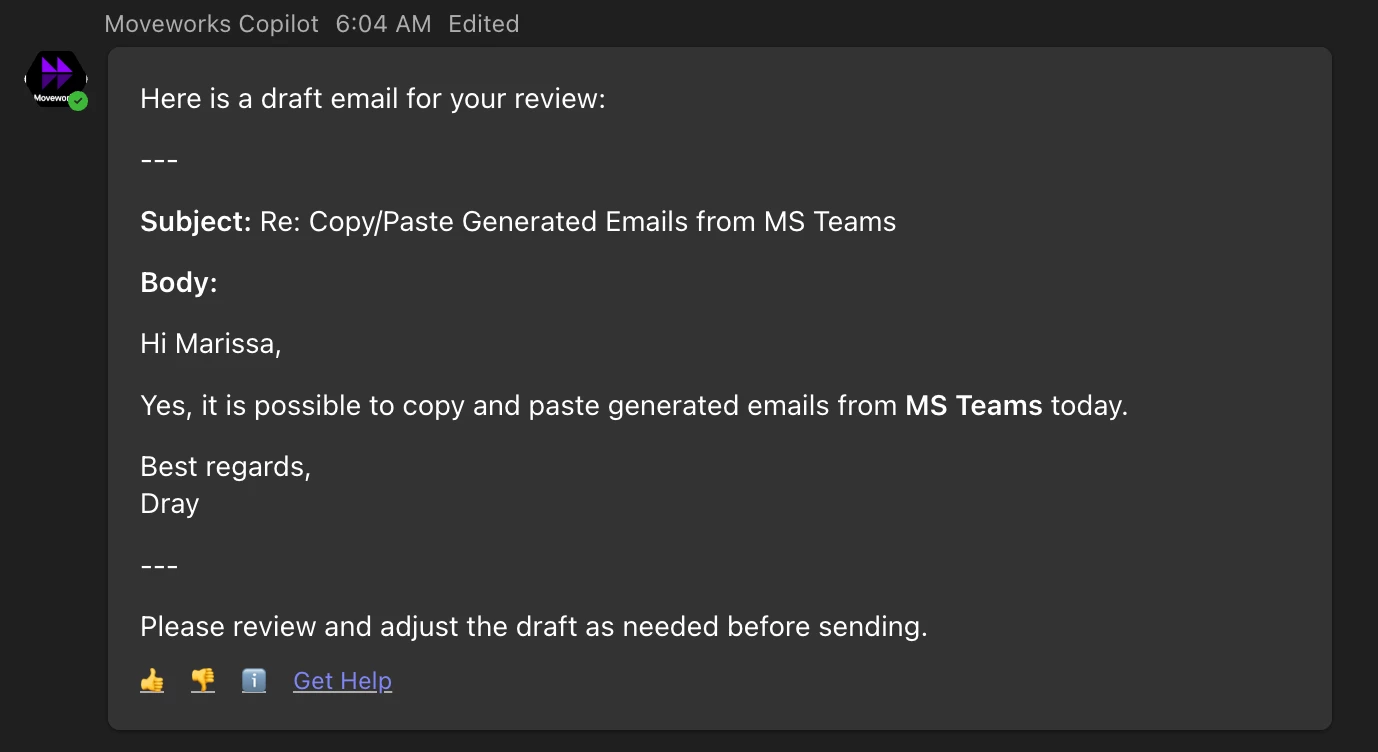 When generating content via Moveworks you cannot copy/paste the content to another platform (email/teams etc) while maintaining the formatting. Once you paste the content, all formatting is lost & has to be redone. I tested in Microsoft Copilot and the formatting is retained.