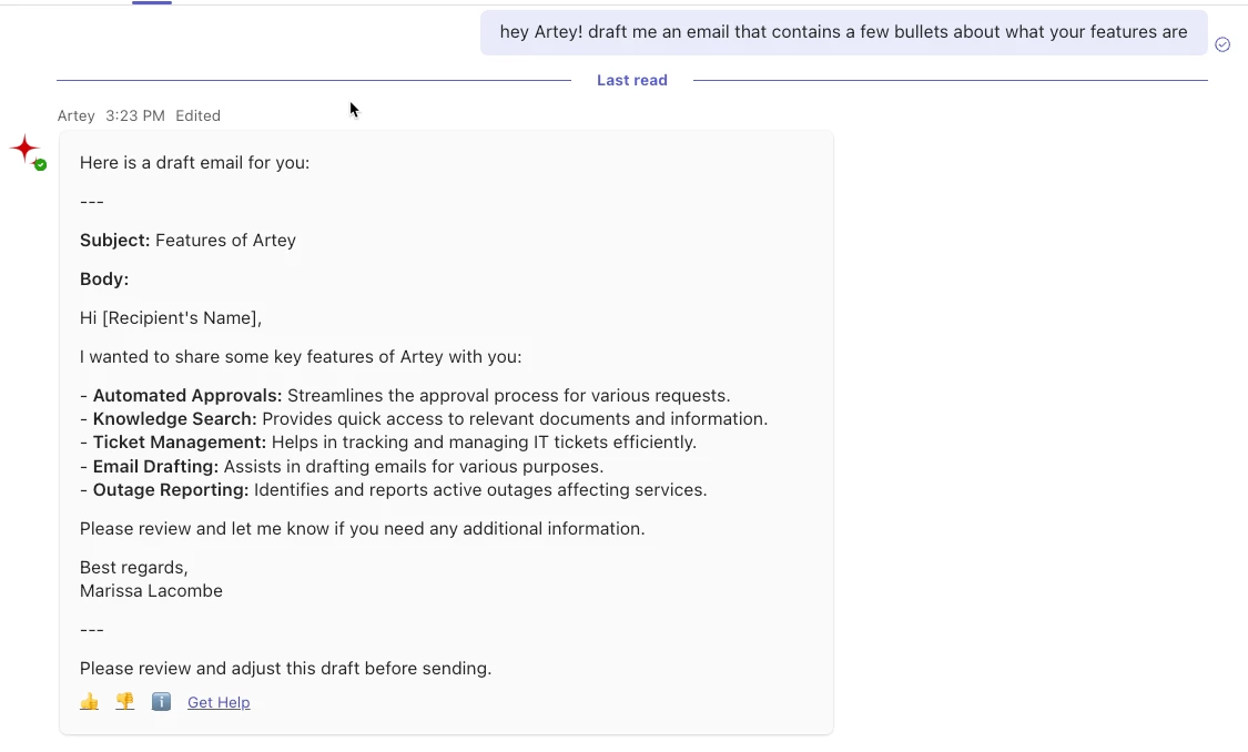 Subject: Features of ArteyBody:Hi [Recipient's Name],I wanted to share some key features of Artey with you:- Automated Approvals: Streamlines the approval process for various requests.- Knowledge Search: Provides quick access to relevant documents and information.- Ticket Management: Helps in tracking and managing IT tickets efficiently.- Email Drafting: Assists in drafting emails for various purposes.- Outage Reporting: Identifies and reports active outages affecting services.Please review and let me know if you need any additional information.Best regards,Marissa Lacombe