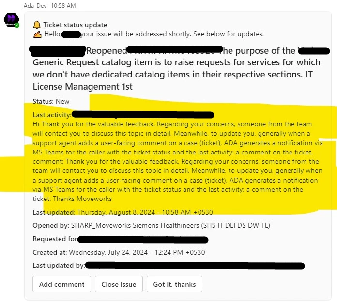 When a user-facing comment is received via ADA's comment notification in MS Teams, the text is displayed in a single line regardless of its original formatting, such as line breaks and spaces. This makes it difficult for users to read and understand longer comments.