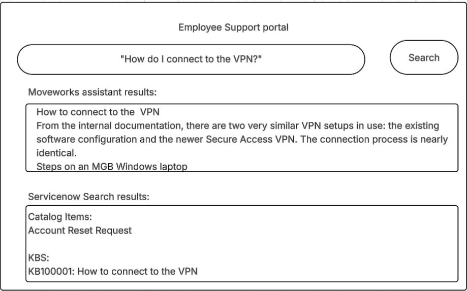 Our preferred experience would be some way of having the Moveworks assistant listen to the Servicenow Portal’s search bar and print a Moveworks assistant response on the search result page.