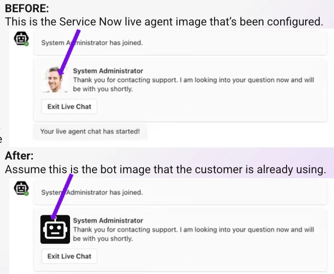 [Service Now specific config] Using your assistant image (AKA bot image) instead of the image you've configured within Service Now: This new configuration option is only available for Service Now live agent customers. If you are having issues displaying the live agent avatar image that’s been configured within ServiceNow, you can now decide to use your assistant image as the default image.