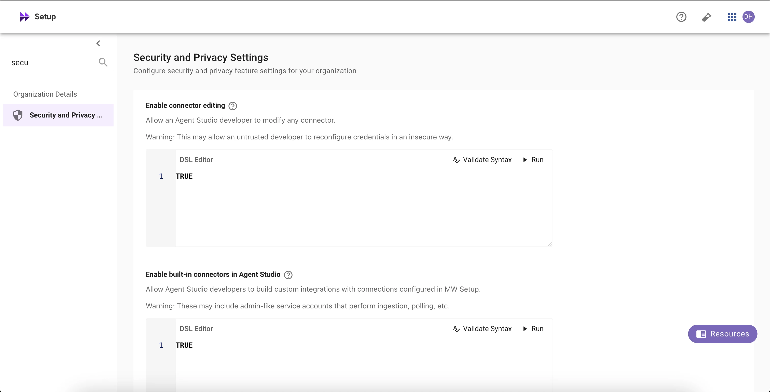 A new Security & Privacy Settings page is now available in Moveworks Setup → Security & Privacy Settings, giving Super Admins centralized, org-wide control over security, governance, and privacy settings for Agent Studio.