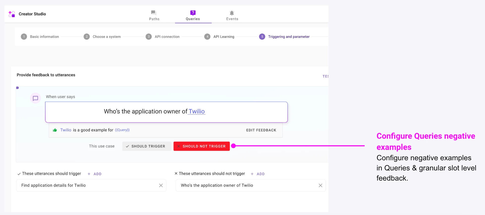 - Negative Queries examples: Configure negative examples in Queries to prevent over-triggering & disambiguate similar use cases.