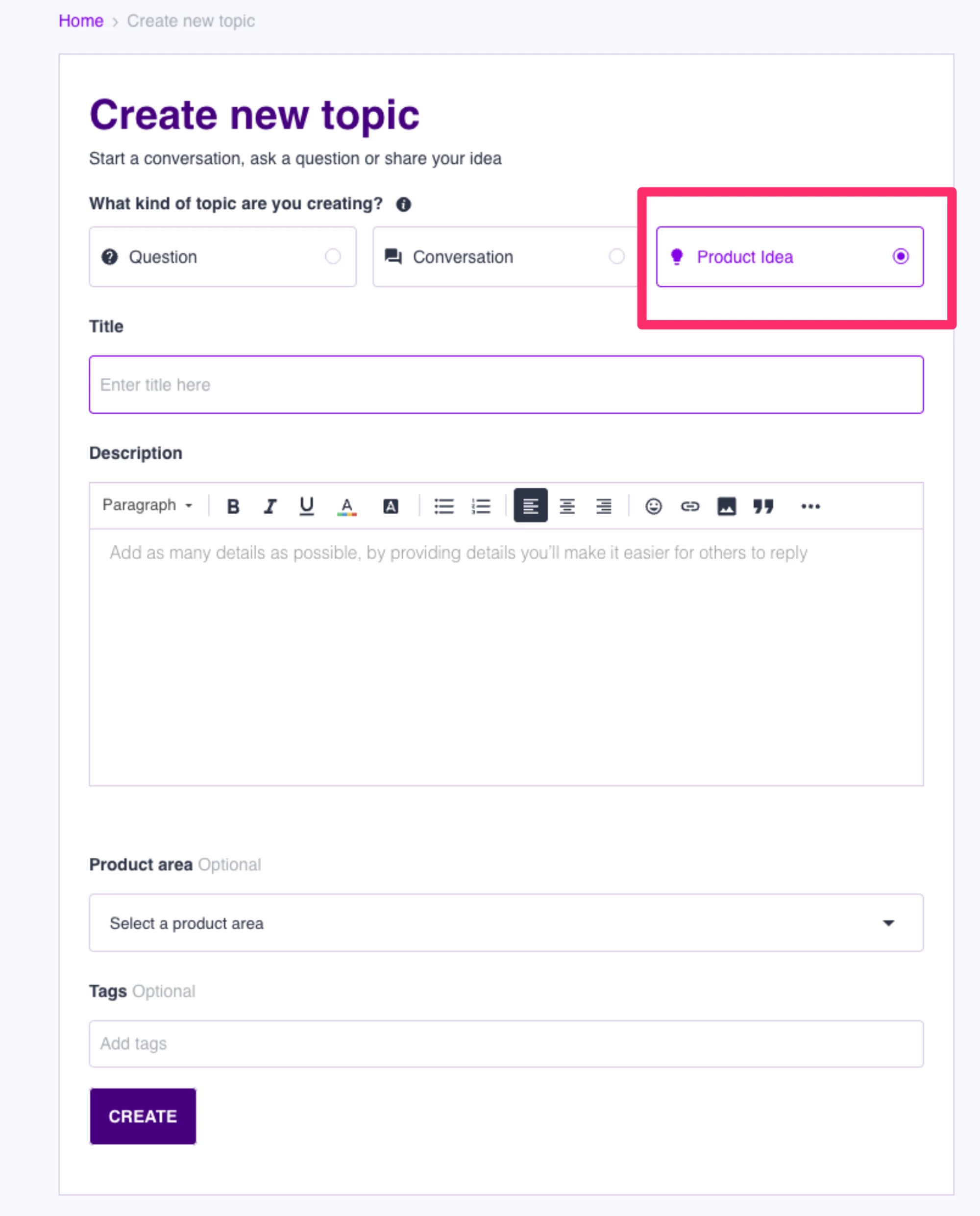 You can submit a Moveworks Product Idea by clicking on the Create Topic button and selecting the “Product Idea” radio button.