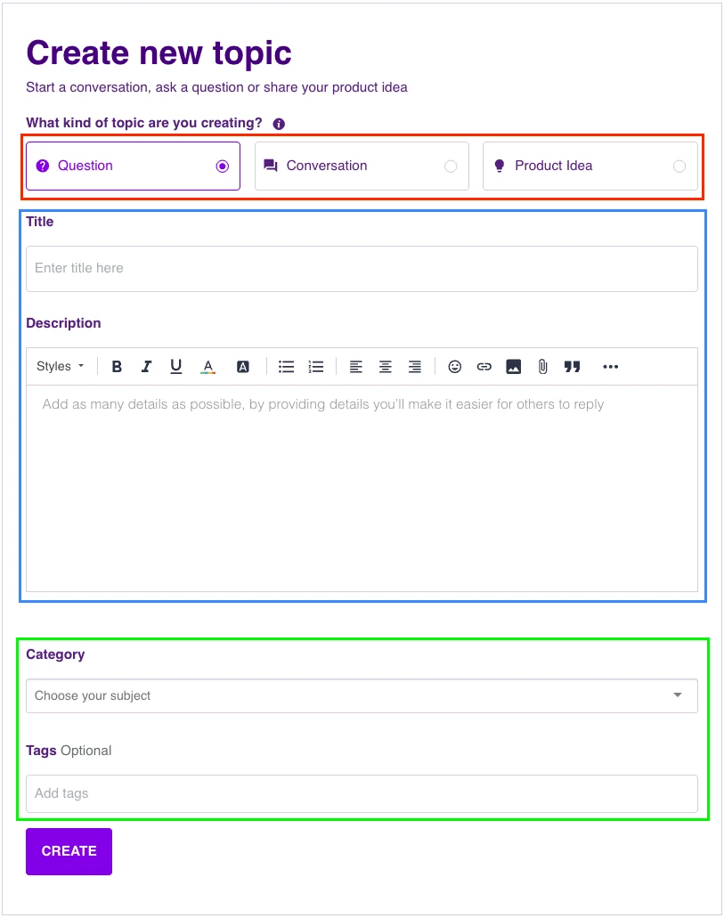 - Choose Question (to ask a question to the community), Discussion (to start a conversation and get ideas from peers) or Product Idea (to submit a feature request)