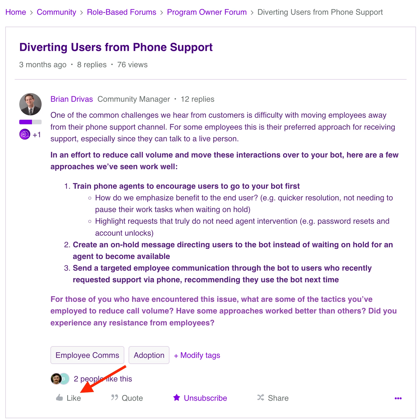 If you like the content or topic, simply click “Like” on the first post of that thread. It will give your fellow community members some love, plus give others good signal on what kinds of topics the community is interested in!