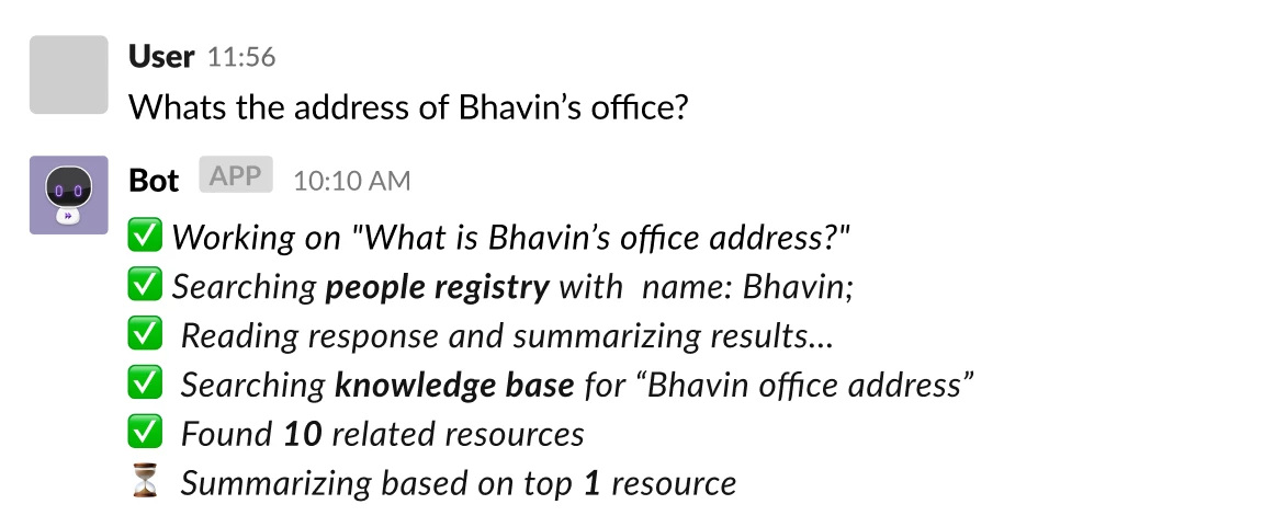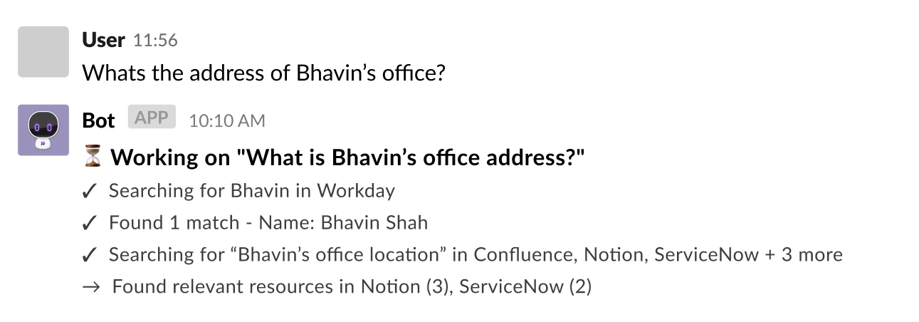 Employees will now see which systems the Assistant is searching in (ex. Confluence, ServiceNow, or SharePoint) and what steps it’s taking to generate a response. You’ll also see improved copy and wording in these progress messages, with additional visual polish coming soon.