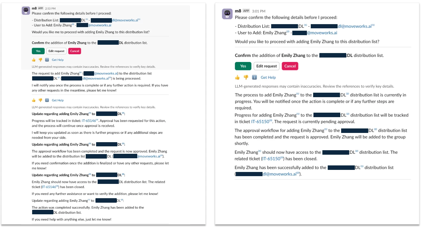 Today, the Assistant sends multiple progress updates when processing back-end tasks like ticket filing or password resets. These messages can clutter the conversation and distract from the outcome. We’re changing that by showing fewer, more concise updates—while still keeping employees informed.