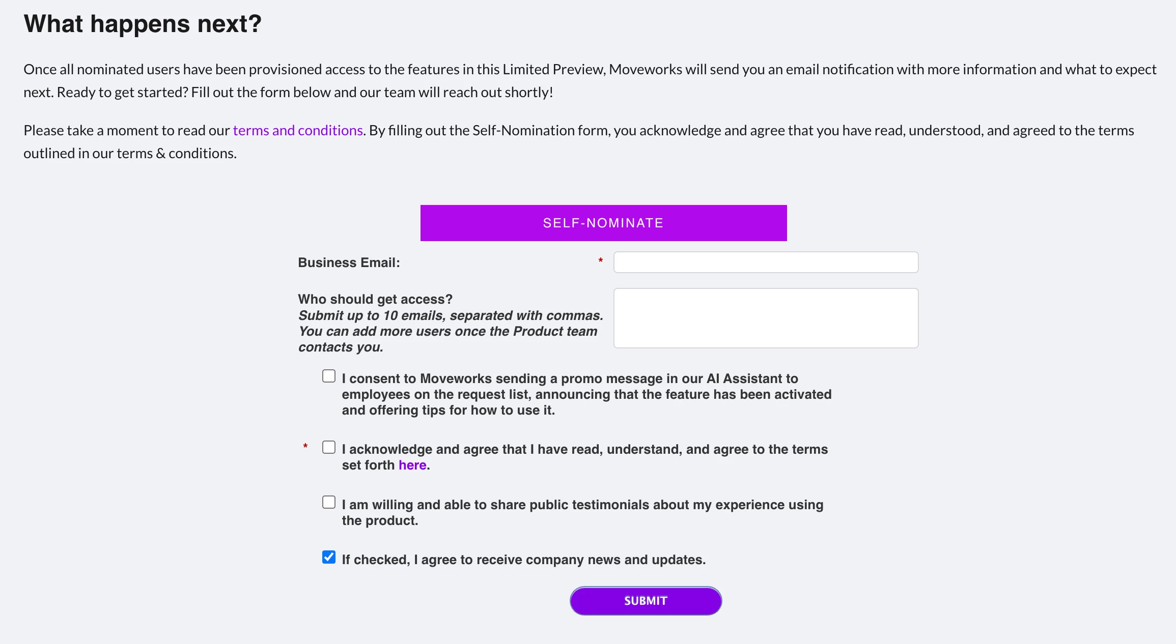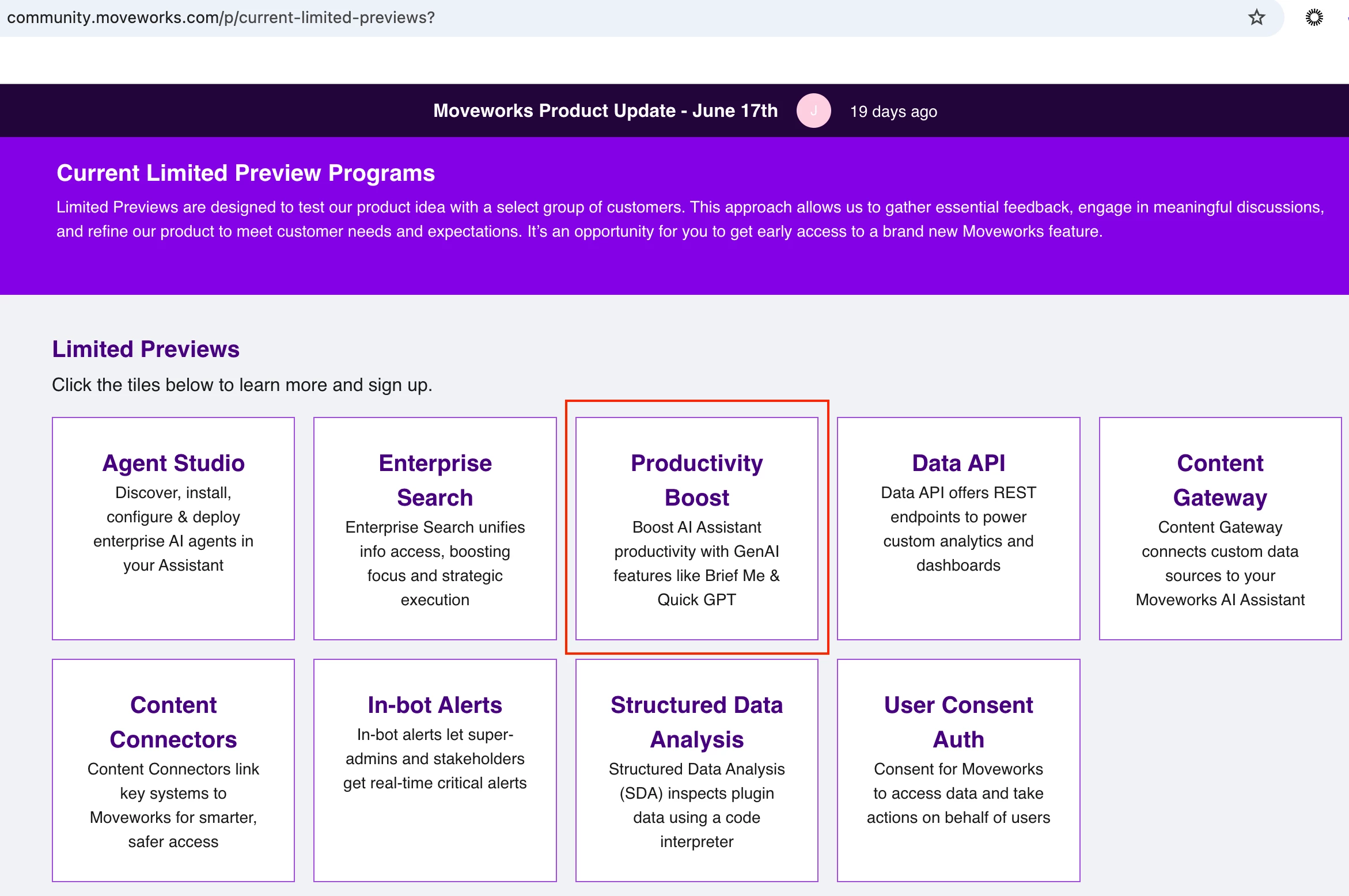 - Login to Moveworks Community → Go to our Productivity Boost Limited Preview Page and fill out self-nomination form. The Moveworks Product team will reach out to you with further info