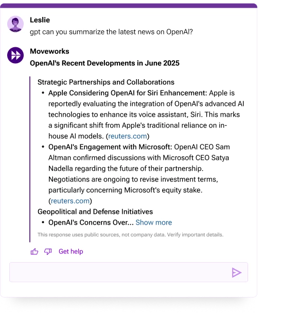 - Moveworks' enterprise controls provide a safer, managed search experience: All searches are covered by our zero day retention policy, so your inputs are never used to train models. Admins can also set additional parameters, work-appropriate filters, and topic exclusions if that’s helpful.