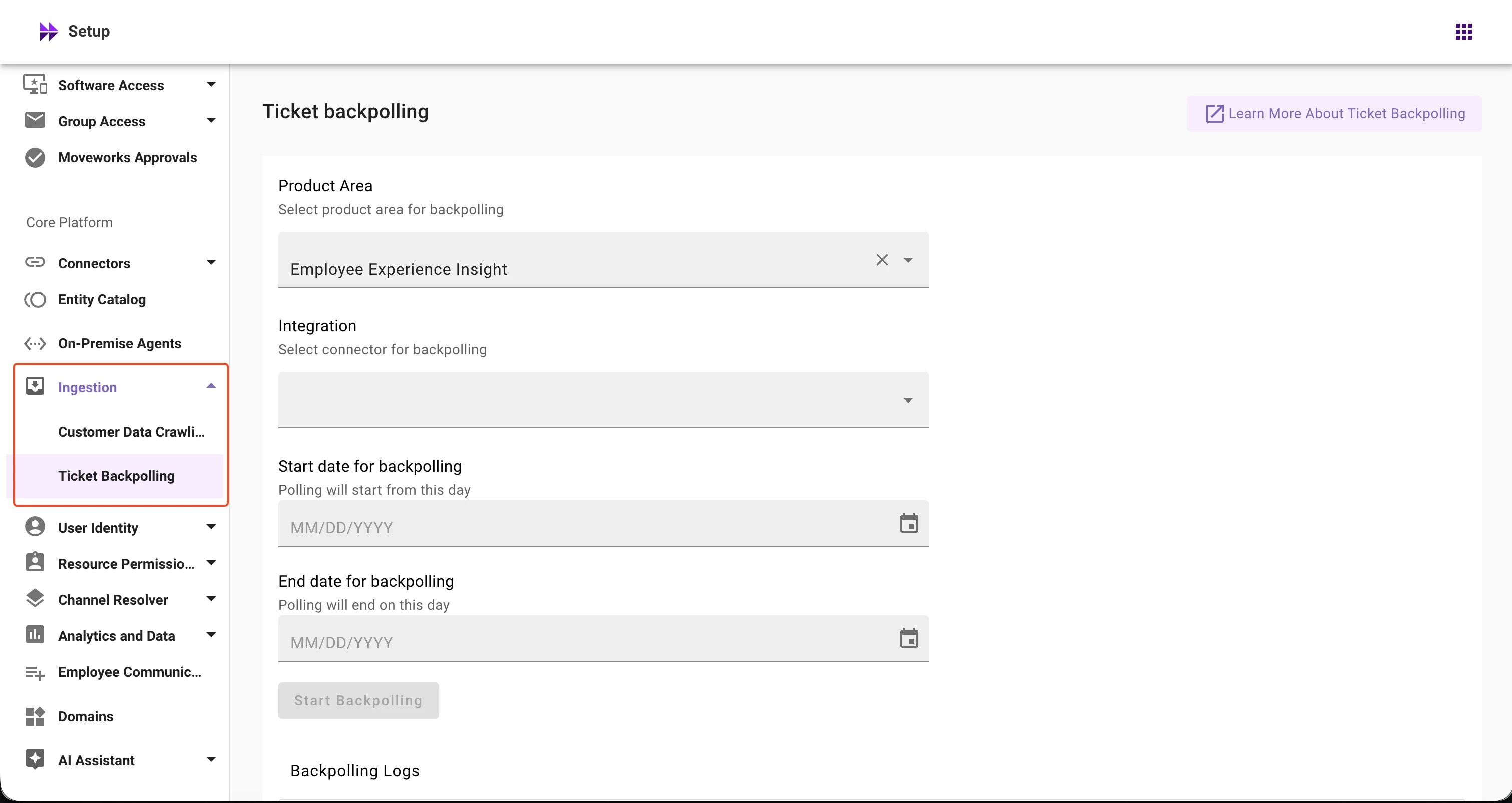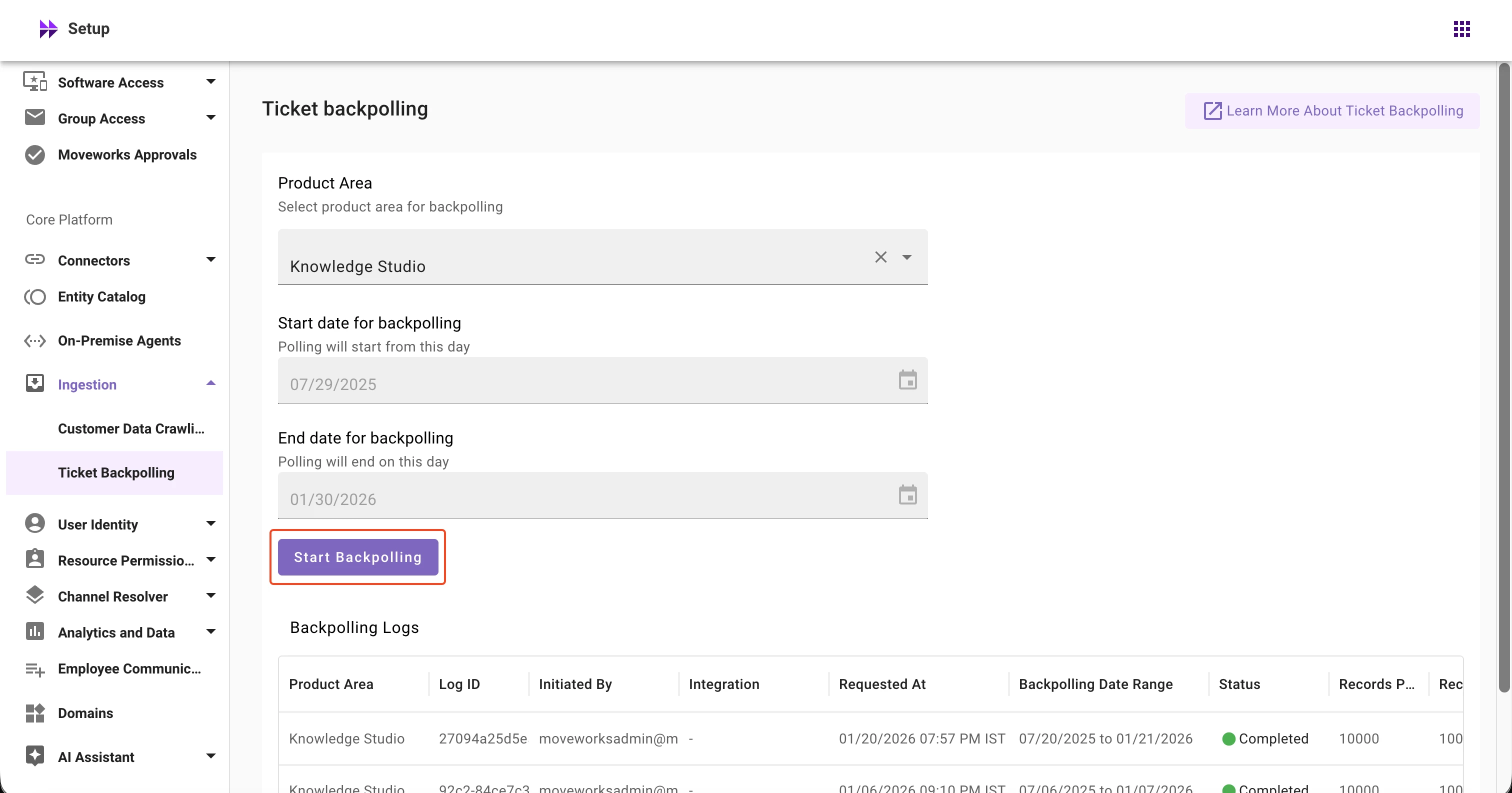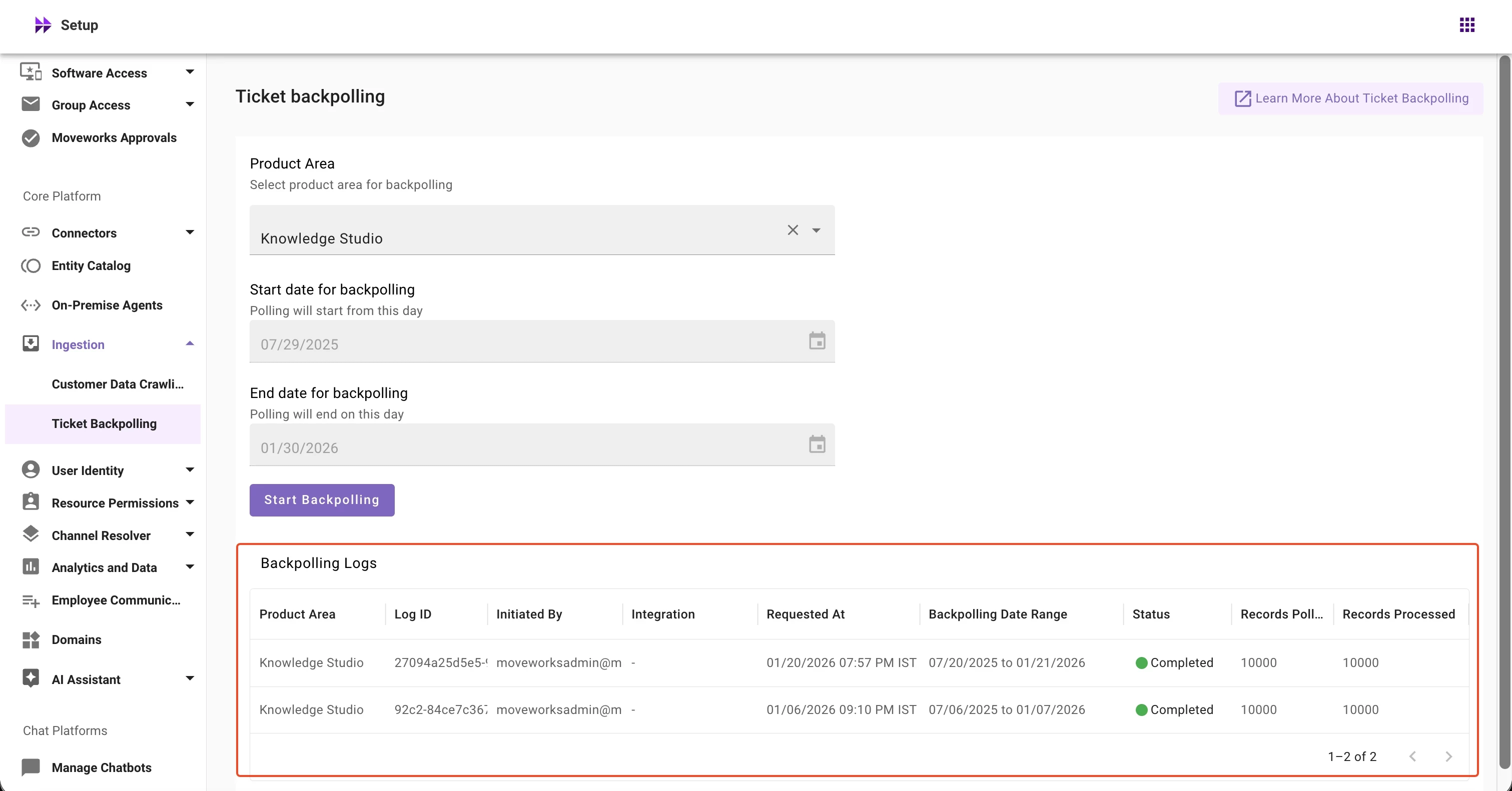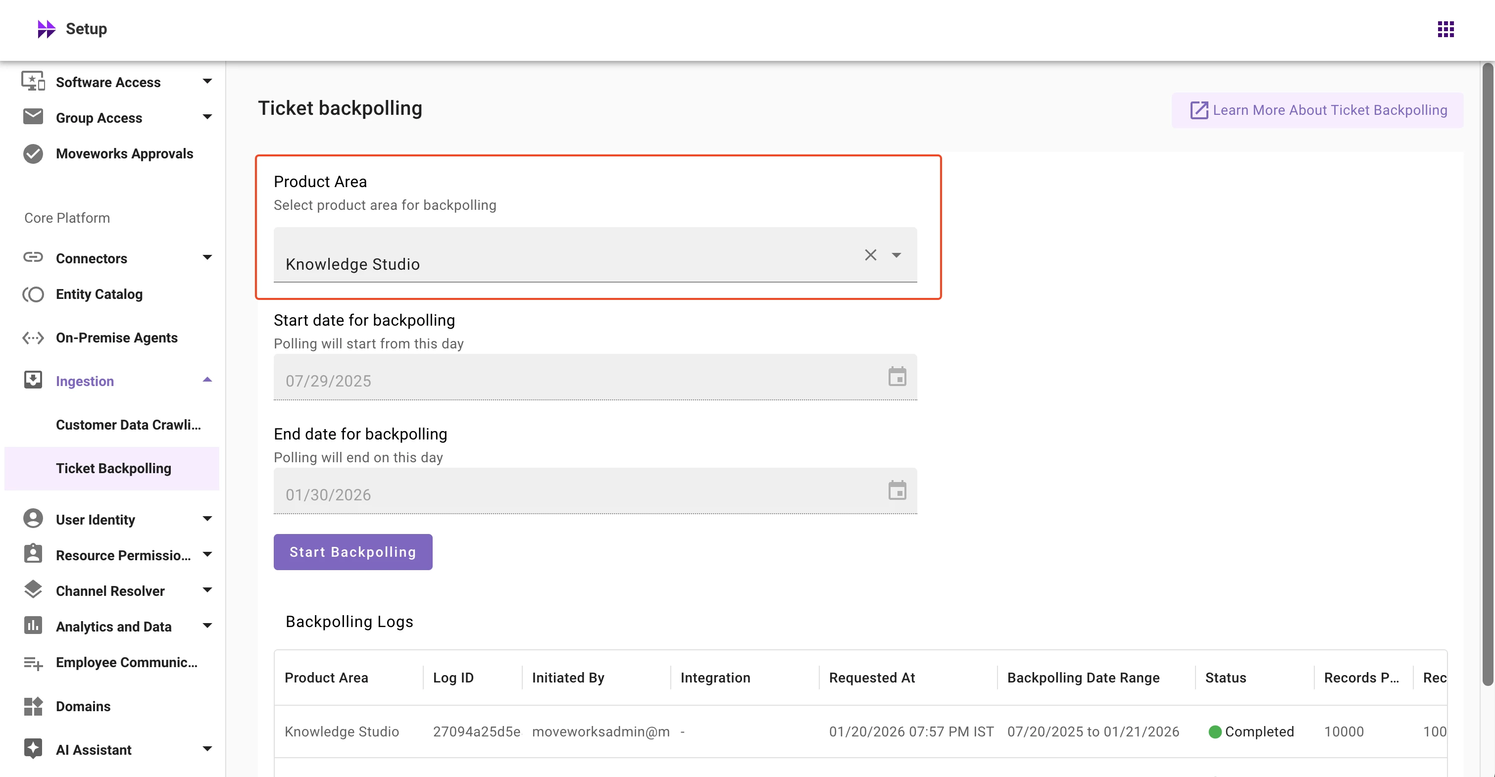 We're excited to announce that Ticket Backpolling for Knowledge Studio is now live in Moveworks Setup. This features allows customer admins to run Knowledge Studio ticketing backpolling directly from Moveworks Setup.